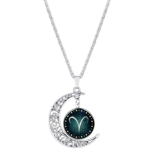 Vintage Jewelry Silver Color with Zodiac Glass Cabochon Choker Crescent Moon Pendant Long Necklace for Women Christmas Gift