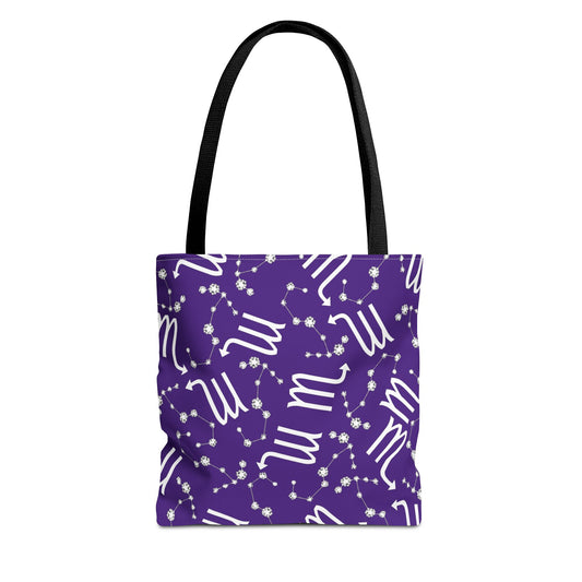 Tote Bag, Scorpio Zodiac Sign, AOP, (Purple, White)