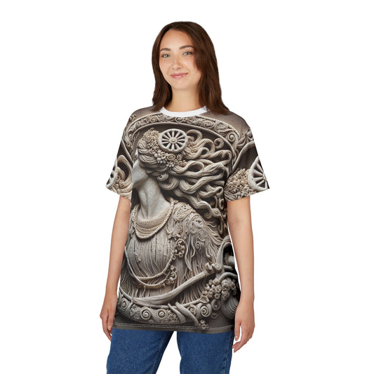 Unisex Cut & Sew T-Shirt (AOP), Lady Stone Carving, Virgo Zodiac Design, Regular fit, 100% Polyester